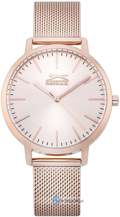Zegarek damski SL.09.6292.3.03 marki Slazenger to dobre połączenie funkcjonalności a także modnego designu. Charakteru nadaje wysokiej jakości cyferblat w kolorze różowo złotym. Pokazana metodą analogową aktualna godzina jest czytelna i szybka do sprawdzenia. Koperta szeroka jest na 36 mm oraz ma grubość 9 mm - w kształcie okrągłym.