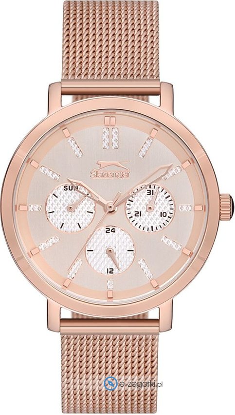 Damski zegarek Slazenger SL.09.6311.4.03 to zegarek, który dzięki swemu wzornictwu zawsze będzie prezentował się dobrze. Niebanalny wygląd zegarka uzyskano m.in. poprzez tarczę w kolorze różowo złotym. Zegarek ten pokazuje godzinę w formacie analogowym dzięki temu odczyt jest bardzo łatwy. Koperta szeroka jest na 36 mm - w kształcie okrągłym.