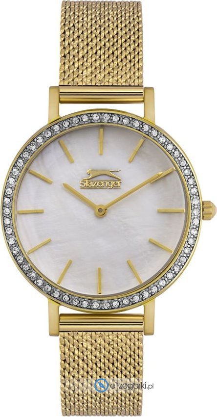 Zegarek damski SL.09.6332.3.05 marki Slazenger to dobre połączenie funkcjonalności oraz modnego designu. Wysokiej trwałości cyferblat zegarka ozdobiono perłowym kolorem. Pokazana metodą analogową bieżąca godzina jest czytelna i łatwa do sprawdzenia. Koperta w barwach koloru złotego szeroka jest na 34 mm - w kształcie okrągłym.