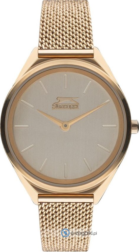 Zegarek damski SL.09.6361.3.02 marki Slazenger to stylowe połączenie funkcjonalności i modnego designu. Wysokiej jakości cyferblat zegarka pokryto różowo złotym kolorem. Aktualna godzina prezentowana jest w sposób analogowy co niezmiernie łatwo pozwala ją odczytać. Koperta szeroka jest na 32 mm - wyróżnia się okrągłym kształtem.