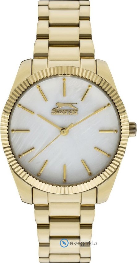 Model SL.09.6366.3.04 marki Slazenger to gustowny zegarek naręczny damski, który jest wyposażony w pomysłowe rozwiązania i funkcje. Charakterystyczny wygląd zegarka uzyskano m.in. poprzez cyferblat w kolorze perłowym. Zaprezentowana metodą analogową aktualna godzina jest czytelna i szybka do sprawdzenia. Koperta jest w kolorze złotym szeroka jest na 34 mm - w kształcie okrągłym.