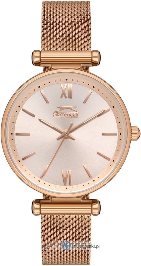 Zegarek damski SL.09.6540.3.02 marki Slazenger to stylowe połączenie funkcjonalności a także modnego wzornictwa. Charakterystyczną stylistykę zegarka uzyskano dzięki tarczy w kolorze różowo złotym. Zegarek ten prezentuje godzinę w formacie analogowym dzięki czemu odczyt jest intuicyjny. Koperta została pokryta kolorem różowo złotym szeroka jest na 31 mm - w kształcie okrągłym.