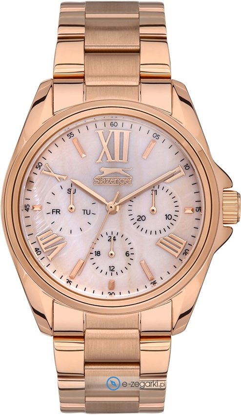 Zegarek damski SL.09.6542.4.02 marki Slazenger to dobre połączenie funkcjonalności oraz ciekawego wzornictwa. Wysokiej jakości cyferblat zegarka pokryto różowo złotym kolorem. Zaprezentowana metodą analogową bieżąca godzina jest czytelna i prosta do odczytania. Koperta jest w kolorze różowo złotym szeroka jest na 38 mm - charakteryzuje się okrągłym kształtem.