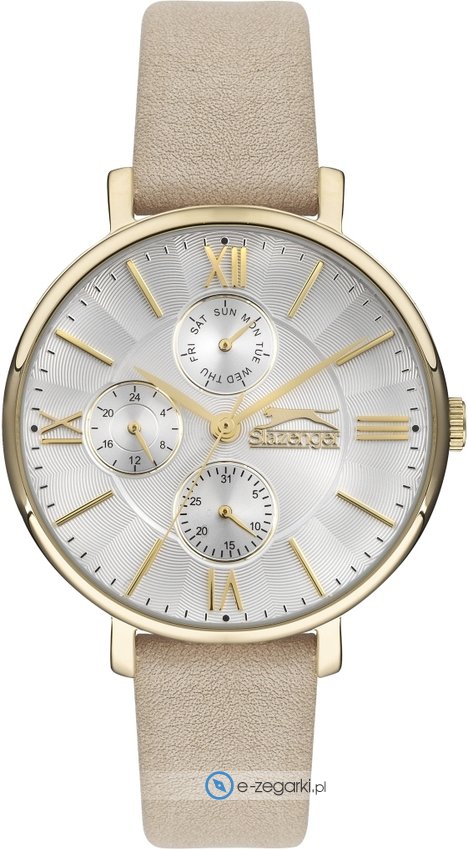 Model SL.09.6544.4.02 marki Slazenger to stylowy zegarek naręczny damski, który posiada ciekawe rozwiązania i funkcje. Charakter zapewnia wysokiej jakości cyferblat w kolorze srebrnym. Godzina przedstawiona jest w sposób analogowy co intuicyjnie pozwala ją odczytać. Koperta jest w kolorze złotym szeroka jest na 36 mm - charakteryzuje się okrągłym kształtem.