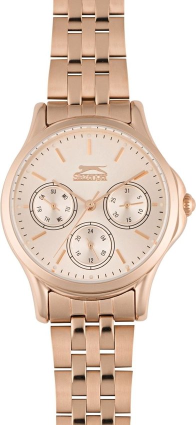 Zegarek damski SL.09.6569.4.05 marki Slazenger to idealne połączenie funkcjonalności i modnego designu. Tarcza zegarka jest w kolorze różowo złotym. Zegarek ten pokazuje aktualny czas w formacie analogowym dzięki czemu odczyt jest intuicyjny. Koperta jest w kolorze różowo złotym szeroka jest na 34 mm - w kształcie okrągłym.