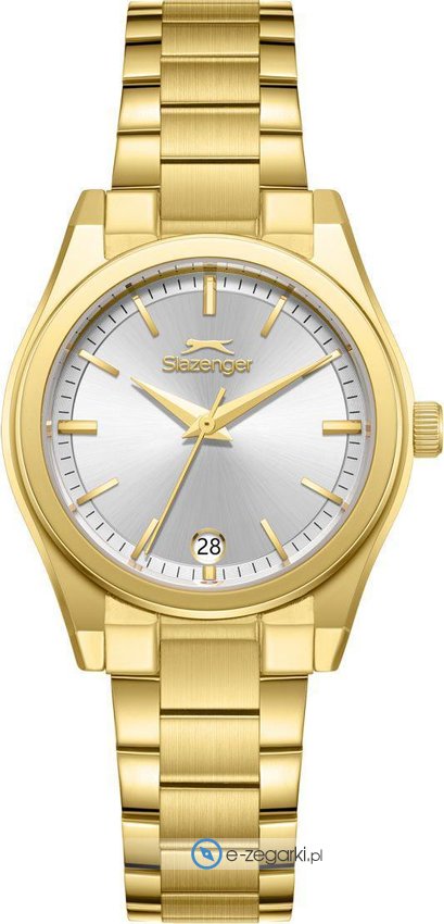 Zegarek damski SL.9.2469.3.03 marki Slazenger to ciekawa pozycja dla ludzi ceniących sobie dbałość o detale jak również bezproblemowe działanie mechanizmów. Atrakcyjną budowę zegarka osiągnięto dzięki tarczy w kolorze srebrnym. Aktualna godzina prezentowana jest w sposób analogowy co bez trudu pozwala ją odczytać. Koperta w barwach koloru złotego szeroka jest na 32 mm - w kształcie okrągłym.