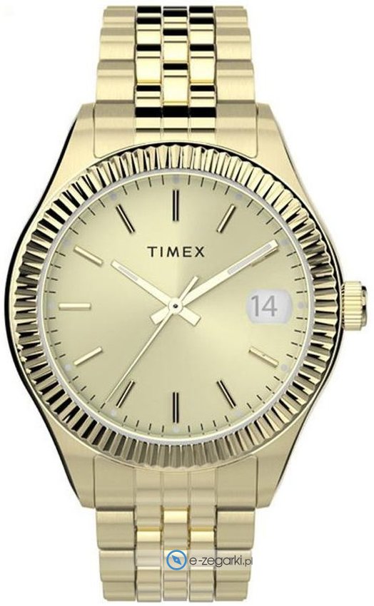 Zegarek damski TW2T86900 marki Timex to idealne połączenie funkcjonalności oraz ciekawego designu. Tarcza zegarka jest w kolorze złotym. Godzina pokazywana jest w sposób analogowy co intuicyjnie pozwala ją odczytać. Koperta w barwach koloru złotego szeroka jest na 34 mm oraz ma grubość 10 mm - w kształcie okrągłym.