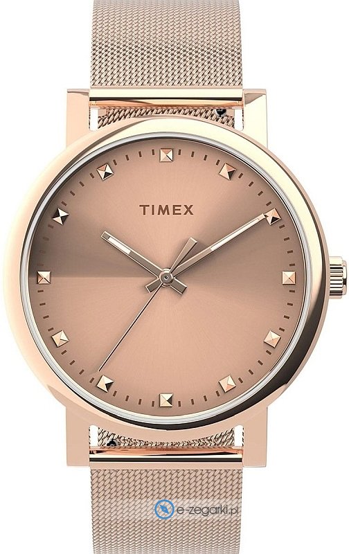 Zegarek damski TW2U05500 marki Timex to ciekawa pozycja dla osób ceniących sobie dbałość o detale oraz sprawne funkcjonowanie mechanizmów. Nieschematyczny wygląd zegarka uzyskano także dzięki tarczy w kolorze różowo złotym. Godzina prezentowana jest w sposób analogowy co bez trudu pozwala ją odczytać. Koperta w odcieniach koloru różowo złotego szeroka jest na 38 mm oraz ma grubość 9 mm - posiada okrągły kształt.