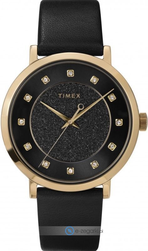 Model TW2U41200 marki Timex to gustowny zegarek naręczny damski, który wyposażono w ciekawe rozwiązania i funkcje. Charakter zapewnia wysokiej jakości tarcza w kolorze czarnym. Aktualna godzina przedstawiona jest w sposób analogowy co intuicyjnie pozwala ją odczytać. Koperta jest w kolorze złotym szeroka jest na 38 mm oraz ma grubość 8 mm - posiada okrągły kształt.