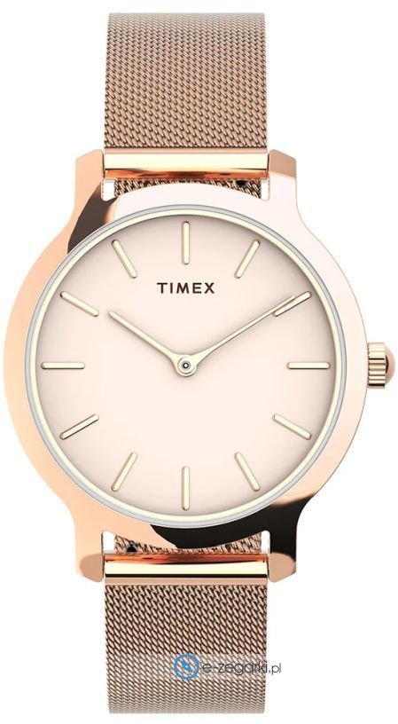 Zegarek damski TW2U86600 marki Timex to dobre połączenie funkcjonalności oraz ciekawego designu. Cyferblat zegarka jest w kolorze różowym. Pokazana metodą analogową bieżąca godzina jest czytelna i szybka do odczytania. Koperta jest w kolorze różowo złotym szeroka jest na 31 mm oraz ma grubość 8 mm - w kształcie okrągłym.