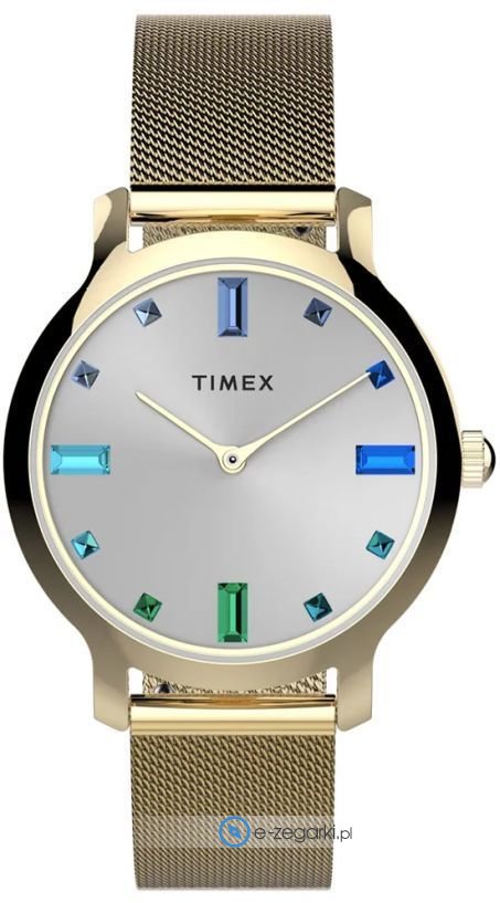 Model TW2U86900 marki Timex to elegancki zegarek naręczny damski, który jest wyposażony w pomysłowe rozwiązania i funkcje. Charakter zapewnia wysokiej klasy tarcza w kolorze srebrnym. Godzina przedstawiona jest w sposób analogowy co bez trudu pozwala ją odczytać. Koperta jest w kolorze złotym szeroka jest na 31 mm oraz ma grubość 7 mm - charakteryzuje się okrągłym kształtem.