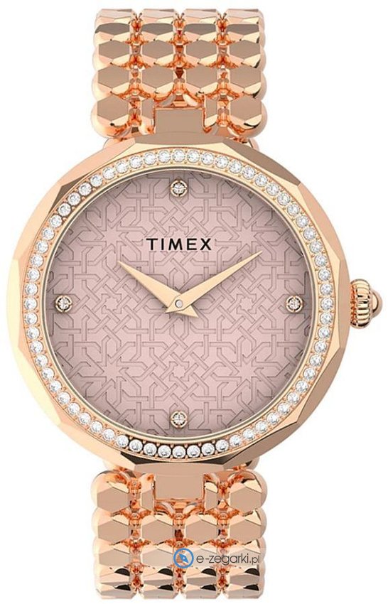 Zegarek damski TW2V02800 marki Timex to idealna pozycja dla osób ceniących sobie dbałość o szczegóły jak również bezproblemowe działanie mechanizmów. Nieschematyczny wygląd zegarka osiągnięto m.in. poprzez tarczę w kolorze różowym. Pokazana metodą analogową bieżąca godzina jest czytelna i łatwa do odczytania. Koperta jest w kolorze różowo złotym szeroka jest na 34 mm oraz ma grubość 9 mm - w kształcie okrągłym.