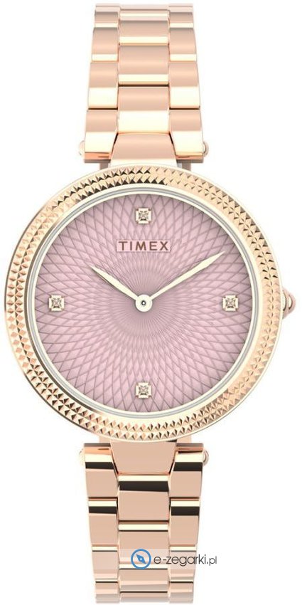 Model TW2V24300 marki Timex to stylowy zegarek naręczny damski, który wyposażono w pomysłowe rozwiązania i funkcje. Charakterystyczny wygląd zegarka osiągnięto m.in. poprzez cyferblat w kolorze różowym. Zegarek ten pokazuje godzinę w formacie analogowym dzięki czemu odczyt jest intuicyjny. Koperta w barwach koloru różowo złotego szeroka jest na 32 mm oraz ma grubość 7 mm - posiada okrągły kształt.