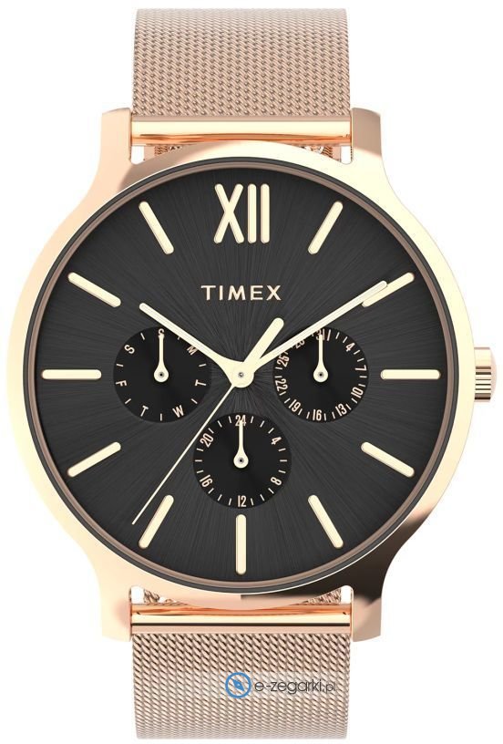 Zegarek damski TW2W19900 marki Timex to dobre połączenie funkcjonalności a także modnego wzornictwa. Niestereotypowy wygląd czasomierza uzyskano także dzięki tarczy w kolorze czarnym. Aktualna godzina pokazywana jest w sposób analogowy co intuicyjnie pozwala ją odczytać. Koperta jest w kolorze różowo złotym szeroka jest na 38 mm oraz ma grubość 7 mm - wyróżnia się okrągłym kształtem.