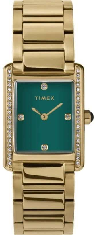 Zegarek damski TW2W87500 marki Timex to idealne połączenie funkcjonalności i modnego designu. Niestereotypowy wygląd zegarka uzyskano m.in. poprzez tarczę w kolorze zielonym. Godzina przedstawiona jest w sposób analogowy co intuicyjnie pozwala ją odczytać. Koperta została ozdobiona kolorem złotym szeroka jest na 24 mm oraz ma grubość 9 mm - posiada prostokątny kształt.