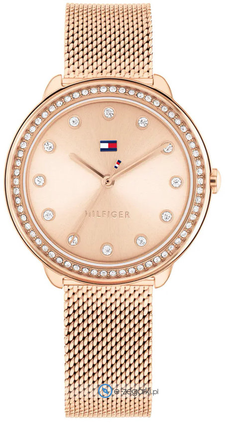 Zegarek damski 1782700 marki Tommy Hilfiger to idealna pozycja dla osób ceniących sobie dbałość o detale oraz bezproblemowe funkcjonowanie mechanizmów. Niebanalny wygląd zegarka osiągnięto również dzięki tarczy w kolorze różowo złotym. Pokazana metodą analogową aktualna godzina jest czytelna i szybka do sprawdzenia. Koperta w odcieniach koloru różowo złotego szeroka jest na 33 mm oraz ma grubość 6 mm - w kształcie okrągłym.