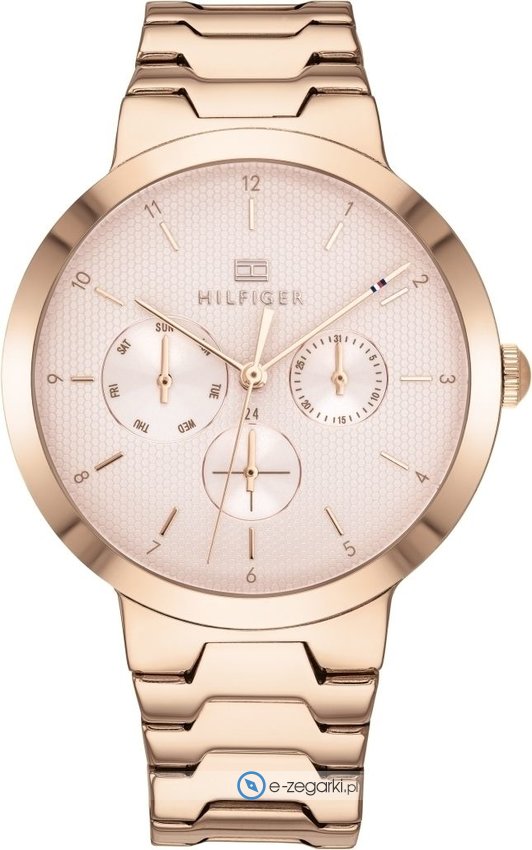 Zegarek damski 1782076 marki Tommy Hilfiger to stylowe połączenie funkcjonalności a także ciekawego designu. Model ten w gamie innych zegarków tego producenta występuje w serii Tommy Hilfiger Alessa. Wysokiej trwałości cyferblat zegarka ozdobiono różowo złotym kolorem. Koperta szeroka jest na 38 mm oraz ma grubość 9 mm - ma okrągły kształt.