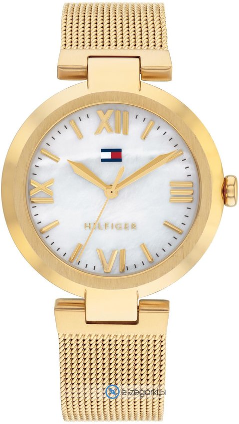 Model damski 1782634 marki Tommy Hilfiger z rodziny Tommy Hilfiger Alice. Charakter zapewnia wysokiej jakości cyferblat w kolorze perłowym. Pokazana metodą analogową aktualna godzina jest czytelna i prosta do sprawdzenia. Koperta w odcieniach koloru złotego szeroka jest na 34 mm - w kształcie okrągłym.
