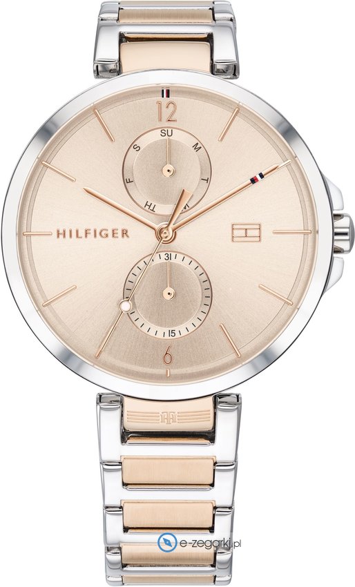 Zegarek damski 1782127 marki Tommy Hilfiger z serii Tommy Hilfiger Angela. Niestereotypowy wygląd czasomierza osiągnięto m.in. poprzez cyferblat w kolorze różowo złotym. Godzina przedstawiona jest w sposób analogowy co bez trudu pozwala ją odczytać. Koperta jest w kolorze srebrnym szeroka jest na 37 mm oraz ma grubość 8 mm - cechuje się okrągłym kształtem.