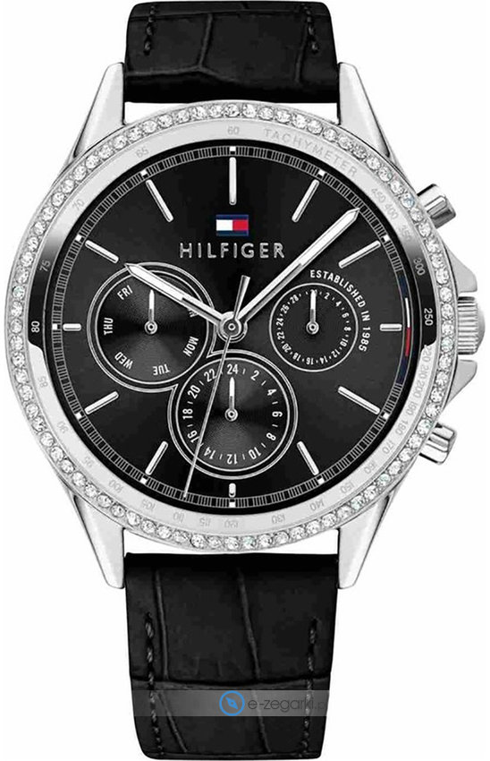 Zegarek damski 1781981 marki Tommy Hilfiger to dobre połączenie funkcjonalności oraz modnego designu. Model ten zalicza się do serii Tommy Hilfiger Ari. Charakterystyczny wygląd czasomierza osiągnięto również dzięki tarczy w kolorze czarnym. Zegarek ten prezentuje aktualny czas w formacie analogowym dzięki czemu odczyt jest bardzo łatwy. Koperta jest w kolorze stalowym szeroka jest na 40 mm oraz ma grubość 9 mm - w kształcie okrągłym.