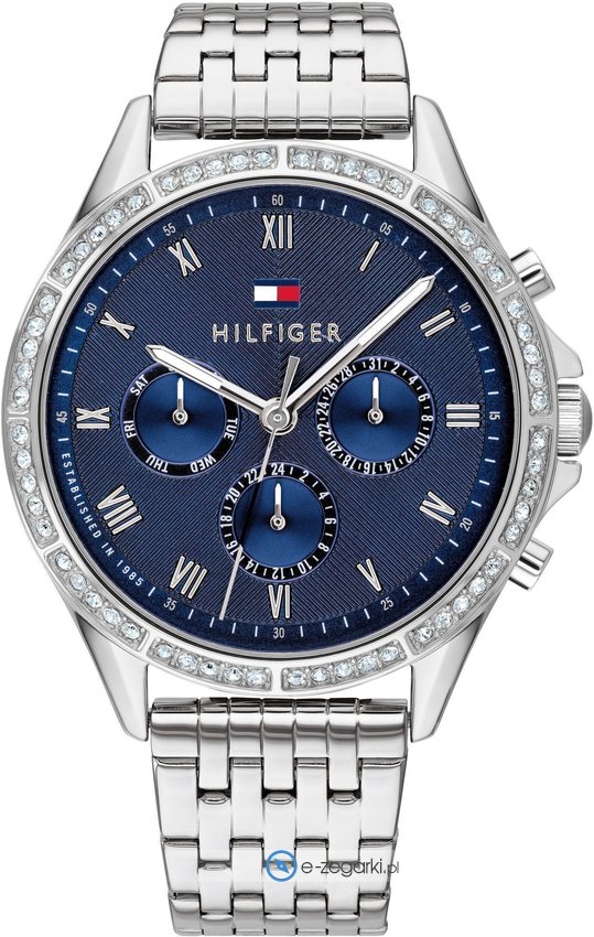 Zegarek 1782141 marki Tommy Hilfiger to gustowny zegarek naręczny damski, który posiada ciekawe rozwiązania oraz funkcje. Model ten pochodzi z serii Tommy Hilfiger Ari. Charakteru nadaje wysokiej klasy tarcza w kolorze granatowym. Zegarek ten prezentuje aktualny czas w formacie analogowym dzięki temu odczyt jest intuicyjny. Koperta w odcieniach koloru srebrnego szeroka jest na 40 mm oraz ma grubość 8 mm - w kształcie okrągłym.