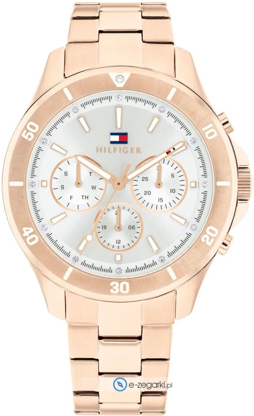 Damski zegarek 1782639 z kolekcji Tommy Hilfiger Aspen marki Tommy Hilfiger to połączenie smaku oraz ciekawych mechanizmów. Niestereotypowy wygląd zegarka osiągnięto m.in. poprzez cyferblat w kolorze srebrnym. Pokazana metodą analogową aktualna godzina jest czytelna i prosta do odczytania. Koperta w odcieniach koloru różowo złotego szeroka jest na 38 mm oraz ma grubość 10 mm - posiada okrągły kształt.