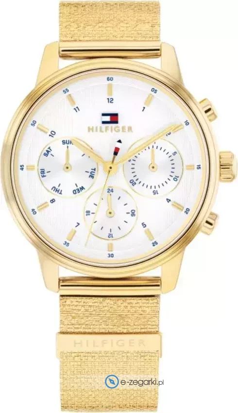 Zegarek damski 1782808 marki Tommy Hilfiger z rodziny Tommy Hilfiger Blake. Charakter zapewnia wysokiej jakości tarcza w kolorze białym. Zaprezentowana metodą analogową bieżąca godzina jest czytelna i łatwa do odczytania. Koperta jest w kolorze złotym szeroka jest na 34 mm oraz ma grubość 8 mm - w kształcie okrągłym.