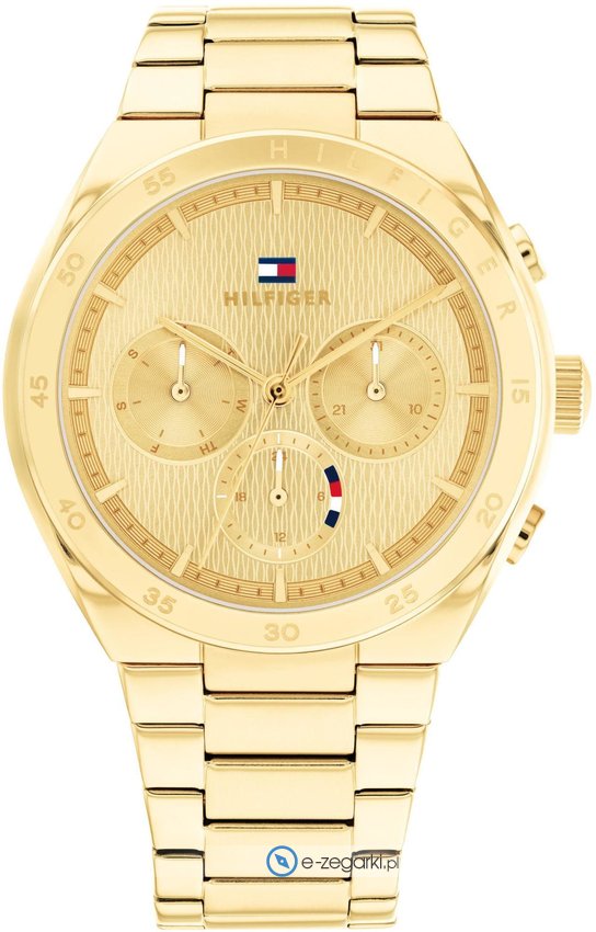 Zegarek damski 1782575 należy do rodziny Tommy Hilfiger Carrie marki Tommy Hilfiger. Cyferblat zegarka jest w kolorze złotym. Zegarek ten pokazuje godzinę w formacie analogowym dzięki czemu odczyt jest intuicyjny. Koperta jest w kolorze złotym szeroka jest na 38 mm oraz ma grubość 10 mm - posiada okrągły kształt.