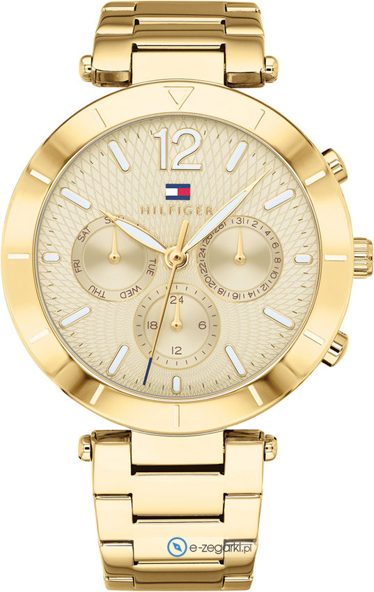 Model 1781878 marki Tommy Hilfiger to gustowny zegarek naręczny damski, który posiada ciekawe rozwiązania i funkcje. Charakter zapewnia wysokiej klasy cyferblat w kolorze złotym. Koperta szeroka jest na 38 mm oraz ma grubość 8 mm - charakteryzuje się okrągłym kształtem.