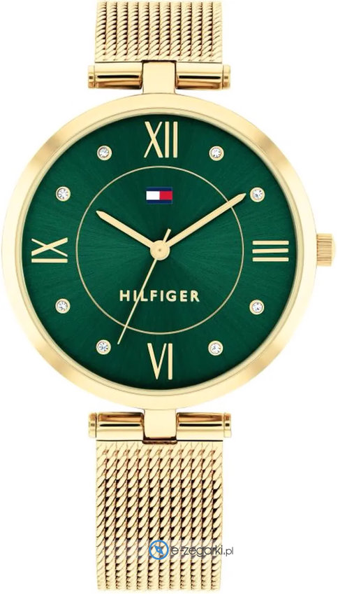 Model damski 1782711 marki Tommy Hilfiger z kolekcji Tommy Hilfiger Ella. Nieschematyczny wygląd czasomierza osiągnięto m.in. poprzez tarczę w kolorze zielonym. Godzina zaprezentowana jest w sposób analogowy co niezmiernie łatwo pozwala ją odczytać. Koperta została pokryta kolorem złotym szeroka jest na 34 mm oraz ma grubość 7 mm - ma okrągły kształt.