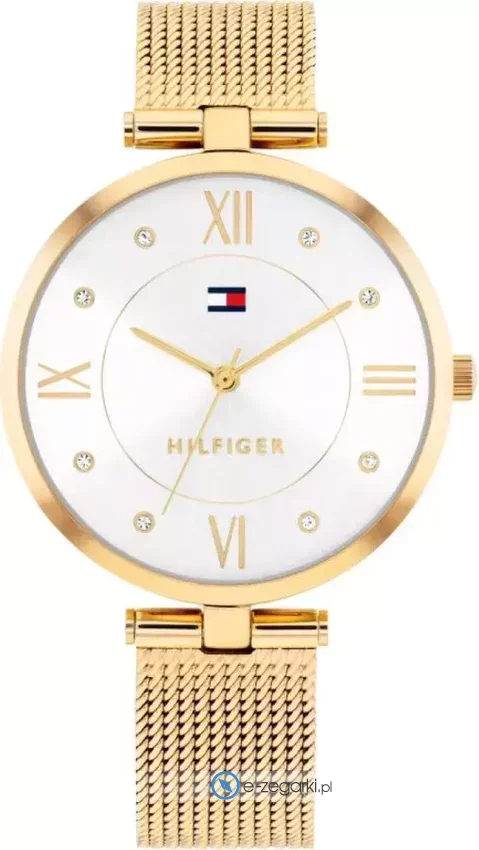 Zegarek damski 1782805 marki Tommy Hilfiger to stylowe połączenie funkcjonalności i modnego designu. Model ten występuje w kolekcji Tommy Hilfiger Ella. Wysokiej trwałości cyferblat zegarka ozdobiono srebrnym kolorem. Pokazana metodą analogową bieżąca godzina jest czytelna i łatwa do sprawdzenia. Koperta jest w kolorze złotym szeroka jest na 34 mm oraz ma grubość 7 mm - charakteryzuje się okrągłym kształtem.