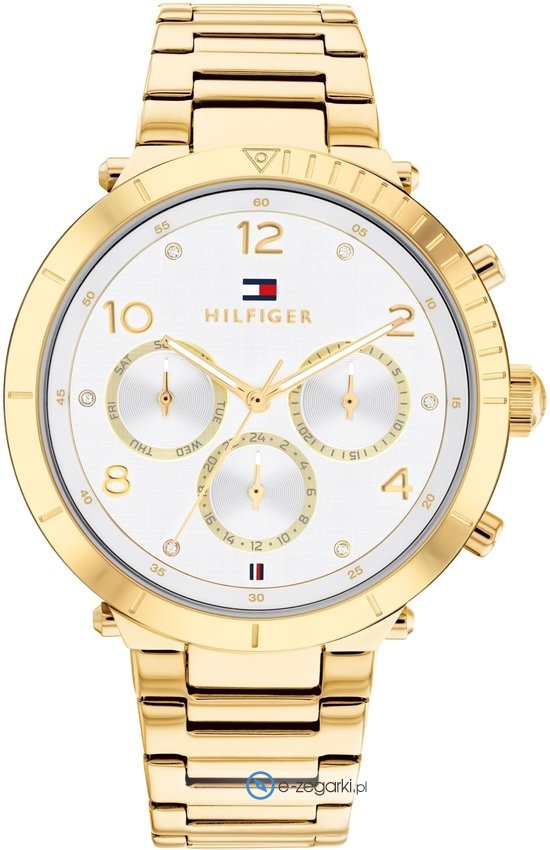 Damski zegarek 1782490 z serii Tommy Hilfiger Emery marki Tommy Hilfiger to połączenie smaku i nieprzeciętnych mechanizmów. Charakter zapewnia wysokiej jakości tarcza w kolorze srebrnym. Aktualna godzina przedstawiona jest w sposób analogowy co niezmiernie łatwo pozwala ją odczytać. Koperta jest w kolorze złotym szeroka jest na 38 mm - w kształcie okrągłym.