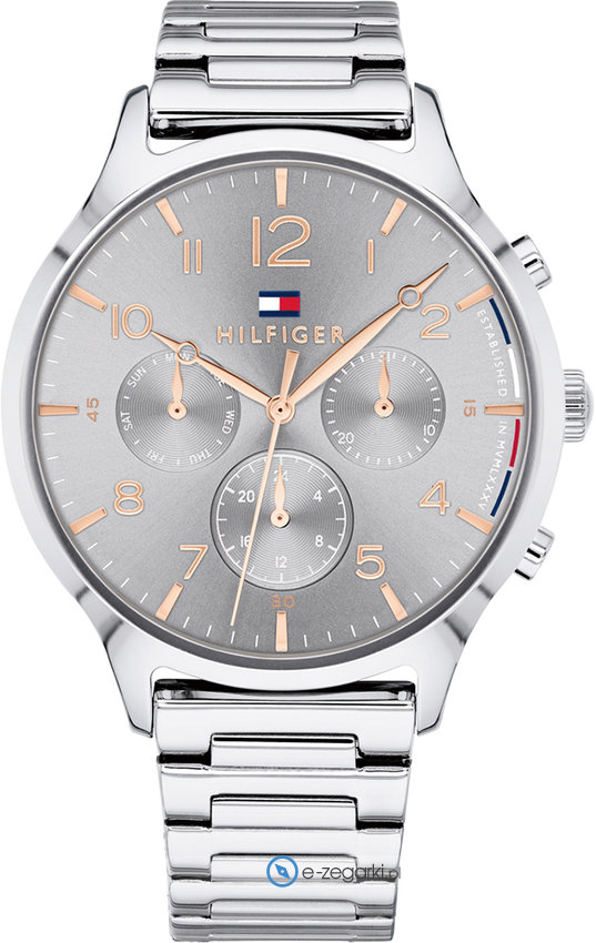 Zegarek damski 1781871 marki Tommy Hilfiger należy do kolekcji Tommy Hilfiger Emmy. Charakter zapewnia wysokiej jakości tarcza w kolorze szarym. Koperta w barwach koloru stalowego szeroka jest na 38 mm oraz ma grubość 9 mm - cechuje się okrągłym kształtem.