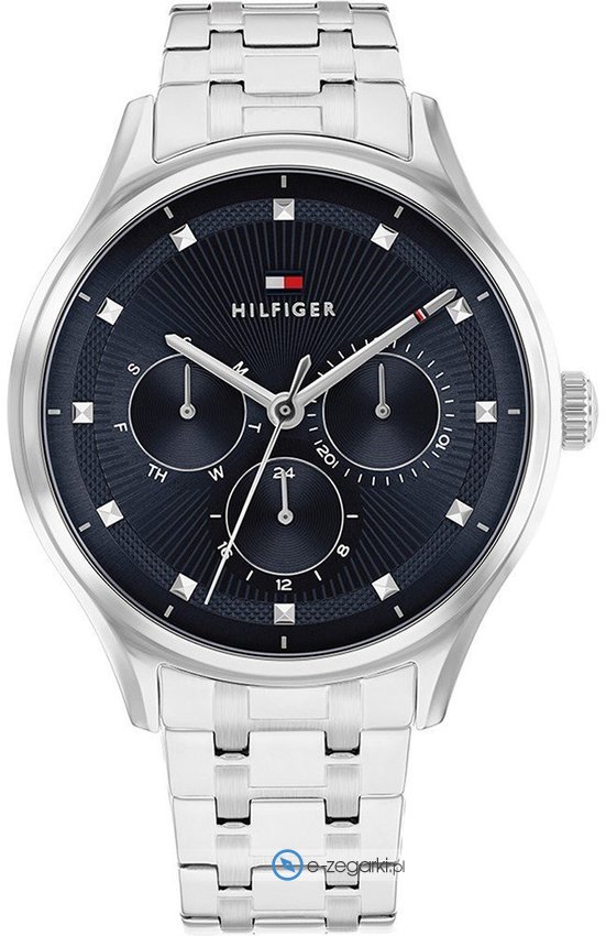 Model damski 1782749 marki Tommy Hilfiger z rodziny Tommy Hilfiger Gianna. Niebanalny wygląd zegarka uzyskano m.in. poprzez tarczę w kolorze granatowym. Aktualna godzina pokazywana jest w sposób analogowy co niezmiernie łatwo pozwala ją odczytać. Koperta w odcieniach koloru srebrnego szeroka jest na 38 mm oraz ma grubość 10 mm - posiada okrągły kształt.