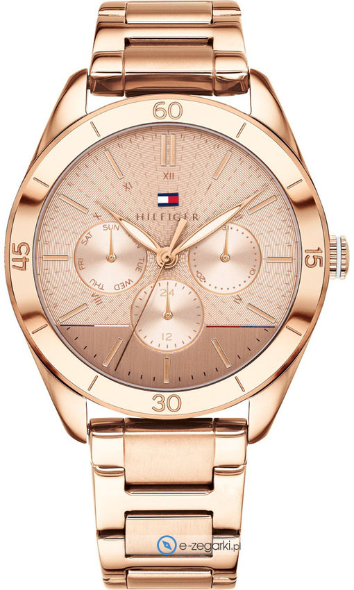 Zegarek damski 1781884 marki Tommy Hilfiger to stylowe połączenie funkcjonalności oraz modnego designu. Model ten należy do kolekcji Tommy Hilfiger Gracie. Nieschematyczny wygląd czasomierza osiągnięto m.in. poprzez cyferblat w kolorze jasnym. Aktualna godzina prezentowana jest w sposób analogowy co intuicyjnie pozwala ją odczytać. Koperta jest pokryta kolorem różowo złotym szeroka jest na 40 mm oraz ma grubość 9 mm - cechuje się okrągłym kształtem.