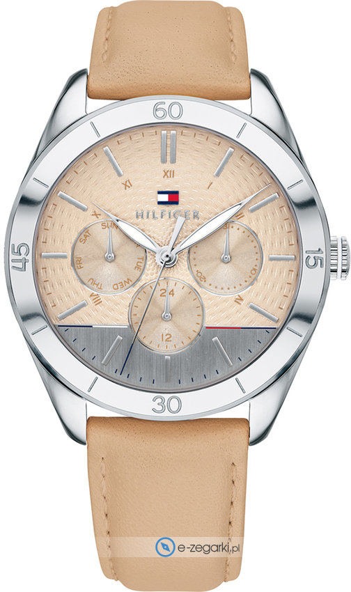 Zegarek damski 1781886 marki Tommy Hilfiger to dobre połączenie funkcjonalności oraz modnego wzornictwa. Model ten zalicza się do kolekcji Tommy Hilfiger Gracie. Styl zapewnia wysokiej jakości cyferblat w kolorze beżowym. Pokazana metodą analogową aktualna godzina jest czytelna i łatwa do sprawdzenia. Koperta została ozdobiona kolorem stalowym szeroka jest na 40 mm oraz ma grubość 9 mm - w kształcie okrągłym.