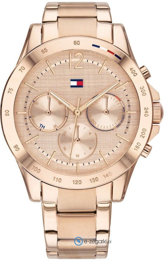 Model 1782197 marki Tommy Hilfiger to gustowny zegarek naręczny damski, który jest wyposażony w ciekawe rozwiązania i funkcje. Tarcza zegarka w kolorze różowo złotym. Godzina pokazywana jest w sposób analogowy co bez trudu pozwala ją odczytać. Koperta szeroka jest na 38 mm oraz ma grubość 9 mm - w kształcie okrągłym.
