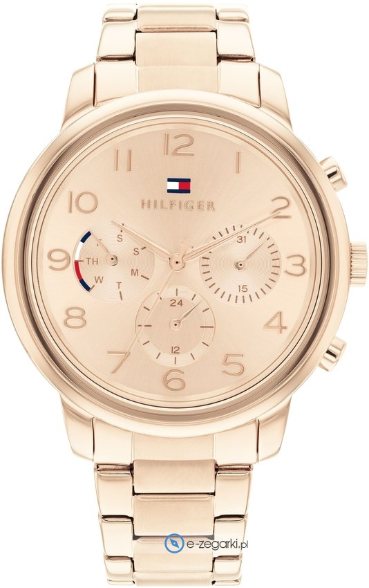 Model 1782526 marki Tommy Hilfiger to gustowny zegarek naręczny damski, który posiada pomysłowe rozwiązania oraz funkcje. Atrakcyjny wygląd zegarka osiągnięto m.in. poprzez tarczę w kolorze różowo złotym. Aktualna godzina pokazywana jest w sposób analogowy co bez trudu pozwala ją odczytać. Koperta w odcieniach koloru różowo złotego szeroka jest na 38 mm oraz ma grubość 9 mm - posiada okrągły kształt.