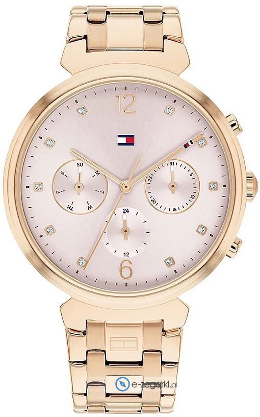 Model damski 1782345 marki Tommy Hilfiger z kolekcji Tommy Hilfiger Ivy. Charakter zapewnia wysokiej jakości cyferblat w kolorze złotym. Aktualna godzina zaprezentowana jest w sposób analogowy co intuicyjnie pozwala ją odczytać. Koperta jest ozdobiona kolorem złotym szeroka jest na 41 mm oraz ma grubość 7 mm - posiada okrągły kształt.