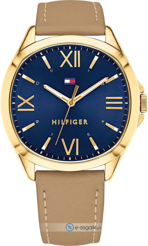 Damski zegarek 1781892 z kolekcji Tommy Hilfiger Jade marki Tommy Hilfiger to połączenie smaku i pomysłowych mechanizmów. Charakterystyczny wygląd czasomierza osiągnięto m.in. poprzez tarczę w kolorze granatowym. Koperta jest ozdobiona kolorem złotym szeroka jest na 37 mm oraz ma grubość 9 mm - posiada okrągły kształt.