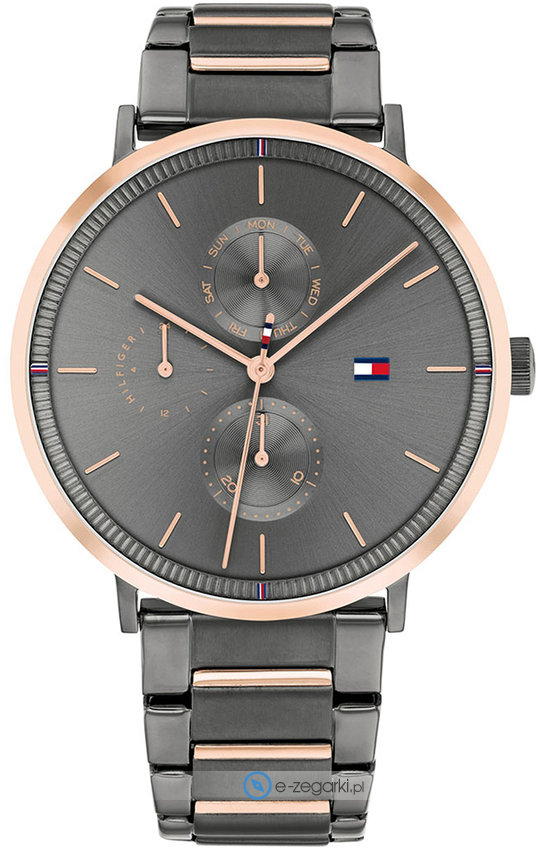 Tommy Hilfiger 1782300 - damski zegarek kierowany dla osób szukających zegarka z rodziny Tommy Hilfiger Jenna. Atrakcyjny wygląd czasomierza osiągnięto m.in. poprzez tarczę w kolorze czarnym. Zegarek ten pokazuje aktualny czas w formacie analogowym dzięki czemu odczyt jest bardzo łatwy. Koperta jest pokryta kolorem różowo złotym szeroka jest na 38 mm oraz ma grubość 8 mm - posiada okrągły kształt.