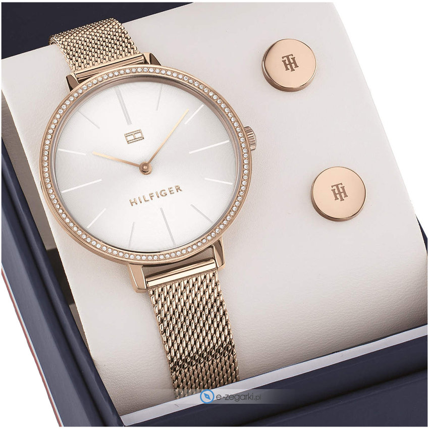 Damski zegarek 2770055 z serii Tommy Hilfiger Kelly marki Tommy Hilfiger to połączenie estetyki i ciekawych funkcji. Tarcza zegarka jest w kolorze szarym. Pokazana metodą analogową bieżąca godzina jest czytelna i łatwa do sprawdzenia. Koperta jest w kolorze różowo złotym szeroka jest na 38 mm oraz ma grubość 6 mm - w kształcie okrągłym.