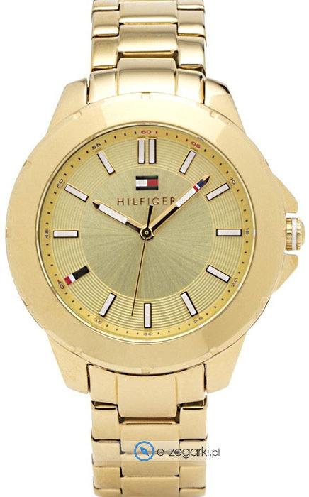Damski zegarek 1781413 z serii Tommy Hilfiger Kimmie marki Tommy Hilfiger to połączenie smaku i nieprzeciętnych funkcji. Stylu nadaje wysokiej jakości tarcza w kolorze złotym. Aktualna godzina prezentowana jest w sposób analogowy co intuicyjnie pozwala ją odczytać. Koperta w barwach koloru złotego szeroka jest na 38 mm oraz ma grubość 10 mm - w kształcie okrągłym.