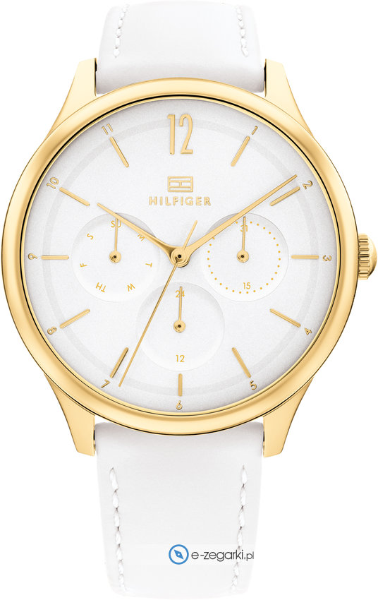 Tommy Hilfiger 1782454 - damski zegarek kierowany dla osób szukających zegarka z serii Tommy Hilfiger Layla. Ciekawy wygląd czasomierza uzyskano m.in. poprzez cyferblat w kolorze białym. Pokazana metodą analogową aktualna godzina jest czytelna i łatwa do odczytania. Koperta w odcieniach koloru złotego szeroka jest na 38 mm oraz ma grubość 10 mm - w kształcie okrągłym.