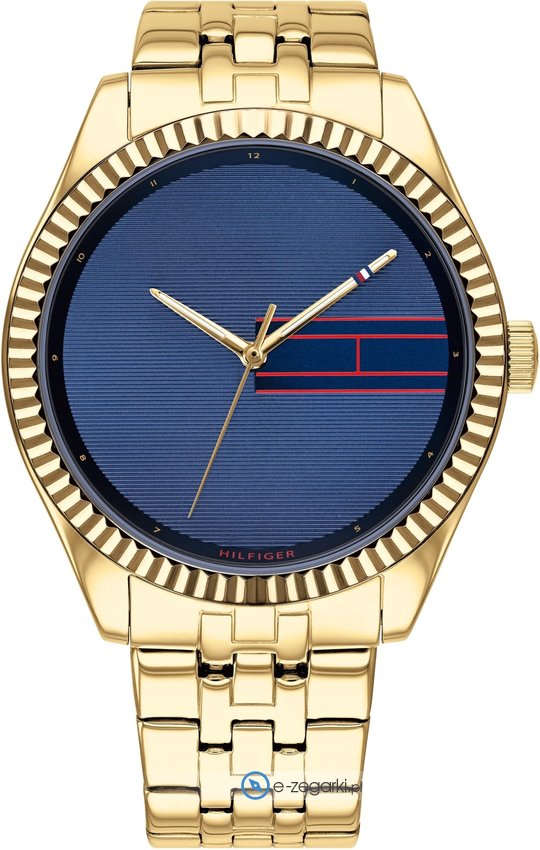 Zegarek damski 1782081 marki Tommy Hilfiger to idealna pozycja dla ludzi ceniących sobie dbałość o szczegóły oraz bezawaryjne funkcjonowanie mechanizmów. Wysokiej jakości tarczę zegarka ozdobiono granatowym kolorem. Koperta w barwach koloru złotego szeroka jest na 38 mm oraz ma grubość 9 mm - ma okrągły kształt.