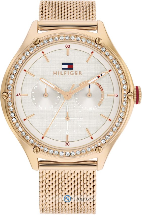 Zegarek damski 1782653 należy do kolekcji Tommy Hilfiger Lexi marki Tommy Hilfiger. Styl zapewnia wysokiej jakości cyferblat w kolorze szarym. Godzina prezentowana jest w sposób analogowy co niezmiernie łatwo pozwala ją odczytać. Koperta w odcieniach koloru różowo złotego szeroka jest na 41 mm oraz ma grubość 10 mm - wyróżnia się okrągłym kształtem.