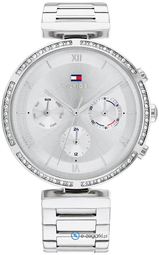 Model damski 1782393 należy do serii Tommy Hilfiger Luna marki Tommy Hilfiger. Wysokiej trwałości tarczę zegarka ozdobiono srebrnym kolorem. Zegarek ten prezentuje aktualny czas w formacie analogowym dzięki czemu odczyt jest bezproblemowy. Koperta jest w kolorze srebrnym szeroka jest na 38 mm oraz ma grubość 9 mm - w kształcie okrągłym.