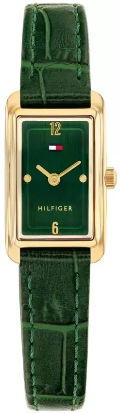 Tommy Hilfiger 1782850 - damski zegarek przeznaczony dla osób szukających zegarka z kolekcji Tommy Hilfiger Madison. Wysokiej trwałości cyferblat zegarka ozdobiono zielonym kolorem. Godzina pokazywana jest w sposób analogowy co intuicyjnie pozwala ją odczytać. Koperta jest w kolorze złotym o grubości 7 mm - ma prostokątny kształt.