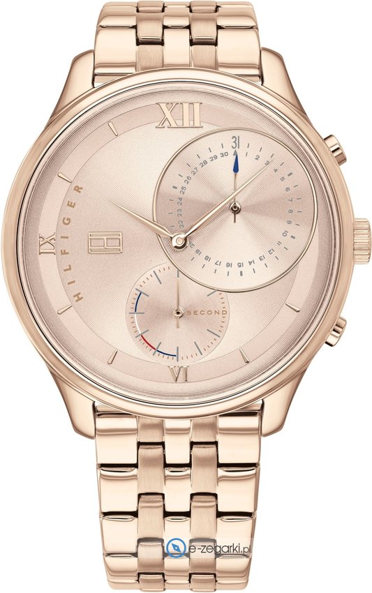Tommy Hilfiger 1782134 to damski zegarek przeznaczony dla osób szukających zegarka z rodziny Tommy Hilfiger Meg. Atrakcyjny wygląd czasomierza osiągnięto również dzięki tarczy w kolorze różowo złotym. Zaprezentowana metodą analogową aktualna godzina jest czytelna i łatwa do sprawdzenia. Koperta szeroka jest na 38 mm oraz ma grubość 8 mm - wyróżnia się okrągłym kształtem.