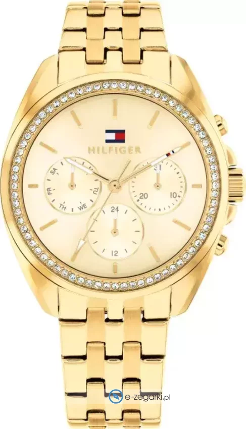 Zegarek damski 1782803 marki Tommy Hilfiger to idealne połączenie funkcjonalności i modnego wzornictwa. Model ten jest z serii Tommy Hilfiger Mellie. Charakterystyczny wygląd zegarka uzyskano również dzięki tarczy w kolorze złotym. Godzina przedstawiona jest w sposób analogowy co intuicyjnie pozwala ją odczytać. Koperta jest w kolorze złotym szeroka jest na 36 mm oraz ma grubość 10 mm - charakteryzuje się okrągłym kształtem.